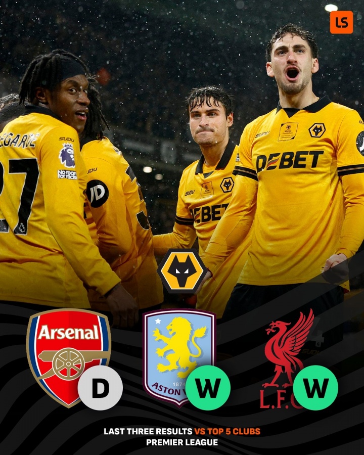 回看狼队最近3场主场,狼队2-2平了阿森纳,2-0拿下维拉,2-1绝杀利物浦。垫底的狼队,近期拿出了极其强势的表现!